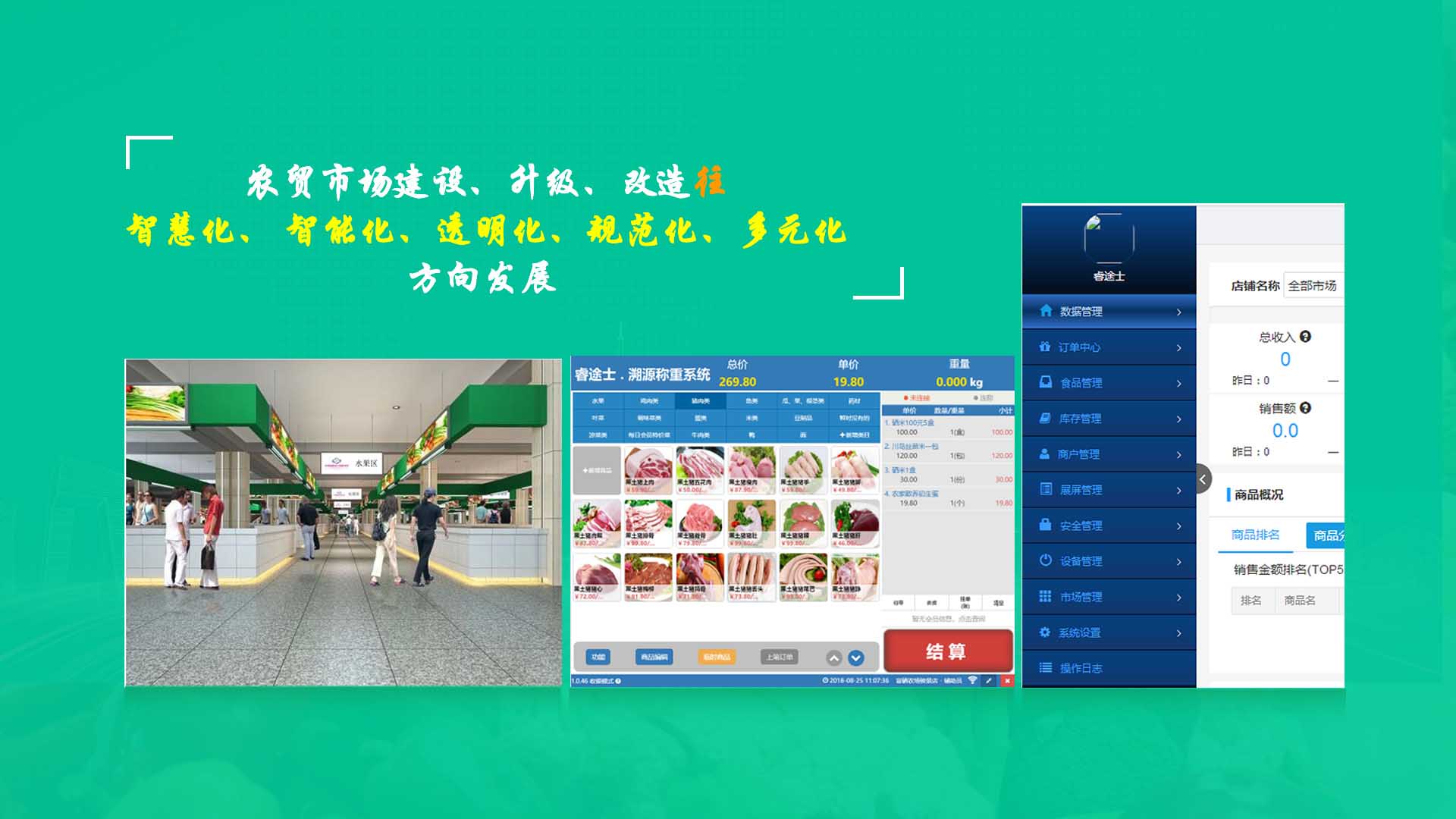 創(chuàng)新實(shí)現(xiàn)了【智慧農(nóng)貿(mào)溯源管理系統(tǒng)】與【智能稱重收銀】一體化解決方案,集市場管理、運(yùn)營管理、溯源追溯、智能收銀大數(shù)據(jù)運(yùn)用于一體,硬件、軟件與管理系統(tǒng)完美結(jié)合。適用于農(nóng)批、農(nóng)貿(mào)市場蔬菜、生鮮、水果、水產(chǎn)、肉類、熟食等稱重和非稱重銷售;由于采用一體化設(shè)計(jì),解決了傳統(tǒng)農(nóng)貿(mào)市場無法實(shí)現(xiàn)的信息化、智能化、可追溯的管理問題;使稱重、收銀、追溯、管理、更透明、公正、安全,讓顧客無后顧之憂,給管理工作帶來極大的便捷與高效,對國內(nèi)農(nóng)產(chǎn)品行業(yè)的發(fā)展、農(nóng)產(chǎn)品流通管理起到了典范作用。 【睿途士首創(chuàng)】顛覆傳統(tǒng)的“智慧農(nóng)貿(mào)市場系統(tǒng)”,解決了傳統(tǒng)農(nóng)貿(mào)系統(tǒng)單一安卓掛屏,昂視不方便看、不直觀、無互動(dòng)性,傳輸信息不齊全、不穩(wěn)定的問題,也解決了按鍵電子秤商品難找、商品代碼難記、按鍵操作不靈活、支付不智能,對收銀管理、銷售商品、菜名、菜價(jià)、打折、優(yōu)惠、會(huì)員、線上下單、采購等無法實(shí)現(xiàn)實(shí)際菜品交易和追溯等問題。 更具顛覆性的是睿途士智慧系統(tǒng)擁有三大管理平臺(tái)(市場管理平臺(tái)、總部運(yùn)營管理平臺(tái)、商戶后臺(tái)管理平臺(tái))、一個(gè)可視操作前臺(tái)和三大追溯功能,讓遠(yuǎn)程管理、數(shù)據(jù)傳輸、人機(jī)互動(dòng)、智能控制、移動(dòng)支付、大數(shù)據(jù)、互聯(lián)通信、云端存儲(chǔ)、人工智能、智能城市、電子定位、智能收銀等功能得以實(shí)現(xiàn)。
